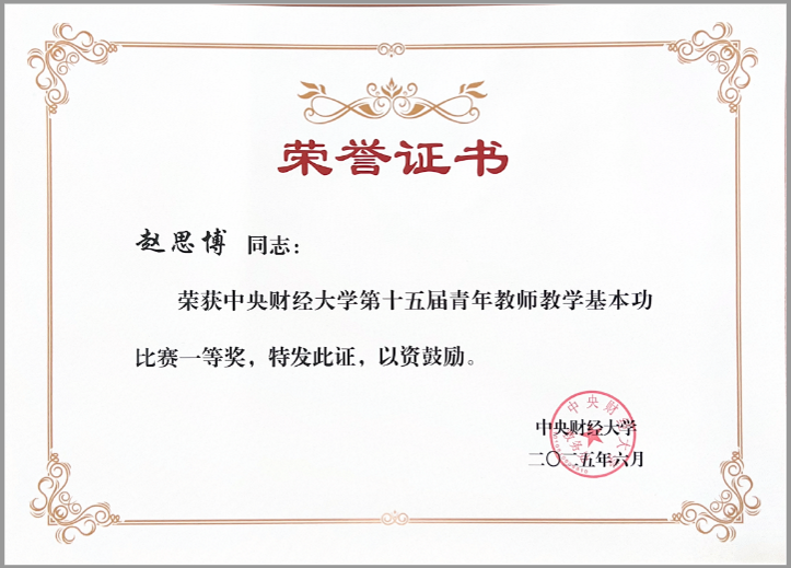 近日,北京高校第十四届青年教师教学基本功比赛(简称“青教赛”)公布评选结果,我院青年教师赵思博副教授在文科类A组比赛中荣获三等奖、最佳教案奖和最佳教学回顾奖。此前,赵思博副教授在“青教赛”校赛中脱颖而出,获得社科二组一等奖。